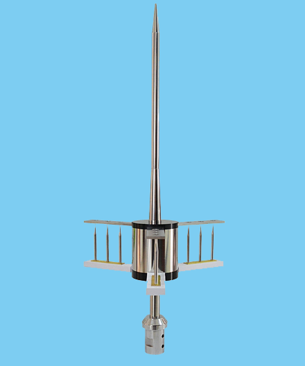 提前放電避雷針主要由激發(fā)器從自然界的電場中吸收并貯存能量,避雷針針尖與大地有良好的電氣連接,處于等電位狀態(tài)。每當(dāng)雷閃發(fā)生前,電場強(qiáng)度會(huì)迅猛增大,激發(fā)器與針尖之間的電位差大致相當(dāng)于雷云與大地之間的電位,它們之間的電壓降迅速增加會(huì)造成尖端打火,并使尖端周圍的空氣離子化,形成尖端放電現(xiàn)象,從而產(chǎn)生一個(gè)早期的上升先導(dǎo)去引導(dǎo),改變雷云的向下先導(dǎo)的走向,將落雷點(diǎn)精確的引到自身上來并迅速、安全地將雷電泄放到大地,避免了傳統(tǒng)避雷針的“繞擊”和“側(cè)擊”現(xiàn)象。